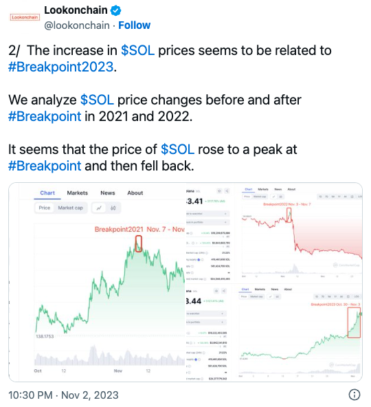 Lookonchain 指出,過去兩個 11 月對 SOL 來說並不好過。雖然原因似乎很明顯- 2021 年11 月初是整個加密貨幣市場的史詩般的頂部,2022 年11 月包括FTX 崩潰- Lookonchain 指出,Solana Breakpoint 會議是生態系統的年度聚會,是11 月初的活動(今年的版本)目前正在阿姆斯特丹舉行),並且與當地的價格最高點一致。